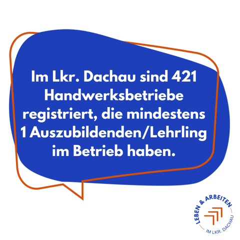 Von den Handwerksbetrieben mit Hauptsitz im Landkreis Dachau sind 421 Handwerksbetriebe bei der HWK registriert, die mindestens 1 Auszubildenden bzw. Lehrling im Betrieb haben.Die Stadt Dachau führt mit 121 gemeldeten Ausbildungsbetrieben, gefolgt von Markt Indersdorf mit 40 Ausbildungsbetrieben und Karlsfeld mit 38 Ausbildungsbetrieben.Ein Dank an das Engagement unserer Handwerker:innen für die Ausbildung junger Talente und die Stärkung unserer Wirtschaft und des Handwerks.